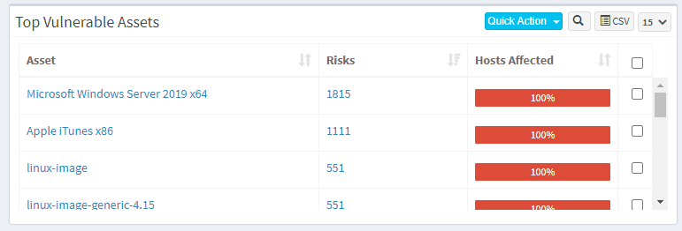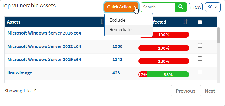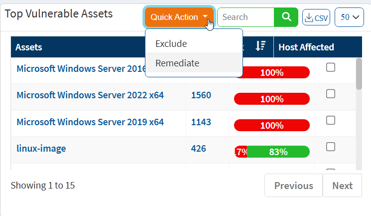 This pane shows the top vulnerable assets by their CVE ID and the number of devices at risk. You can download the excel sheet with the asset information by clicking on the CSV icon. The search option is provided to search the asset with the asset name. In addition, Quick Action section allows to exclude and remediate the vulnerabilities of the corresponding assets.