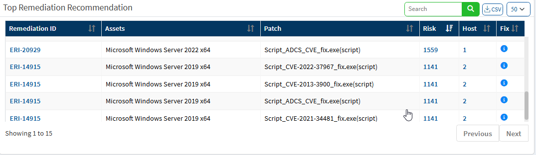 This page lists the top remediation recommended based on the CRE. It will list remediations that can address a maximum number of deviations. You can download the CSV file by clicking on the CSV icon.