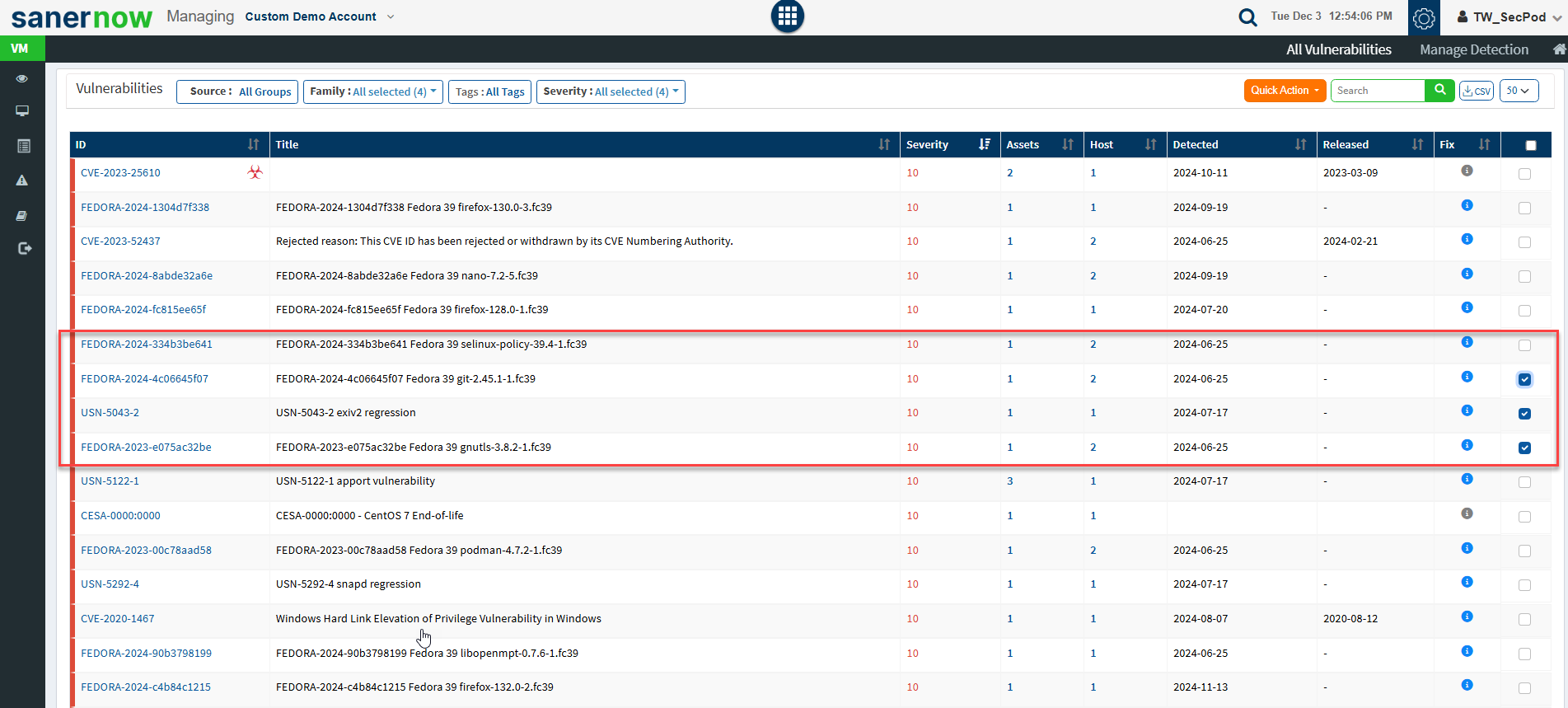 Step 3: Click on the checkboxes displayed towards the right side of the vulnerabilities that you want to exclude. And then click on the Quick Action button.
