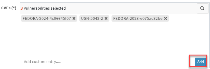 - CVEs – Here, you will see all the vulnerabilities you selected to be excluded. At the same time, you can manually add vulnerabilities to be excluded using the Add button.