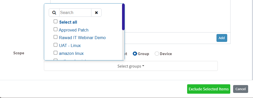 - Group – When you select Group, the selected vulnerabilities will be excluded for all the devices that belong to the selected Group(s) till the date specified by you. (You can select multiple groups)
