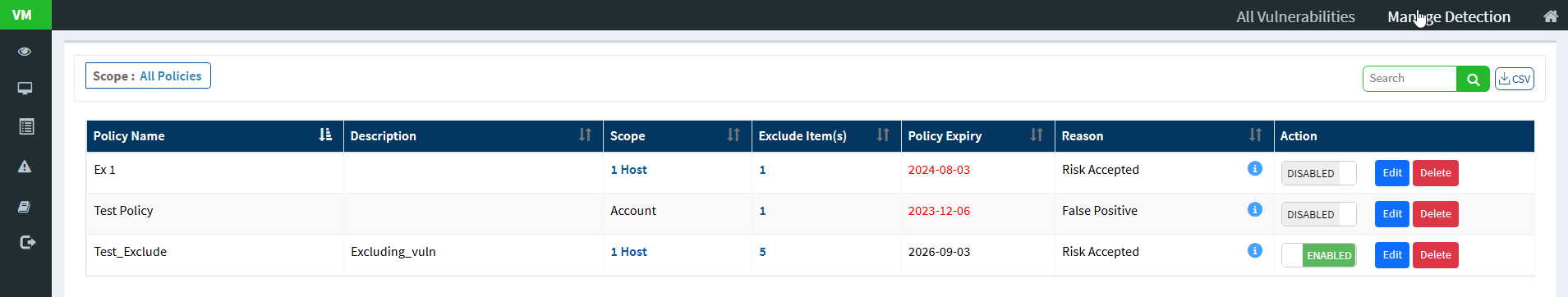 How to Enable/Disable, Edit and Delete an existing Exclude Policy in VM tool