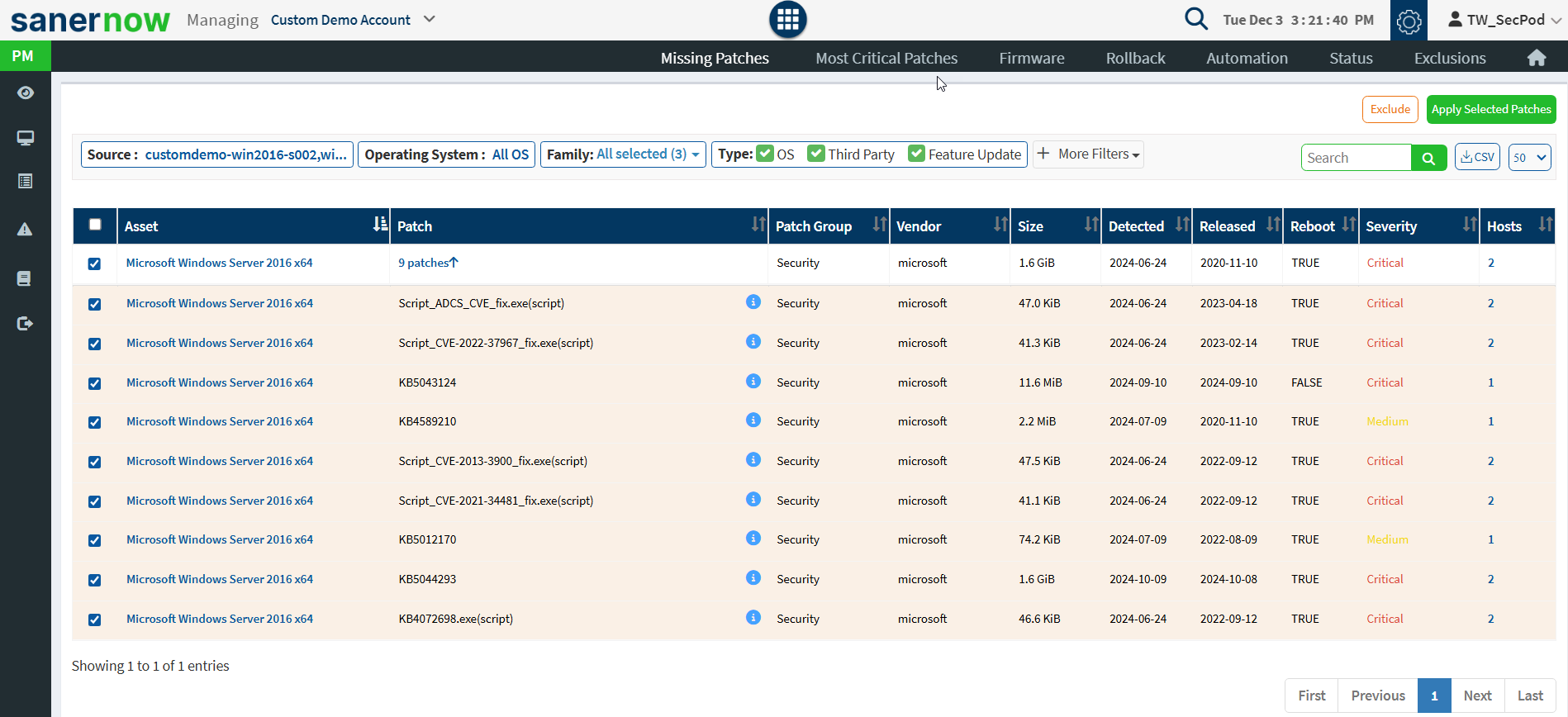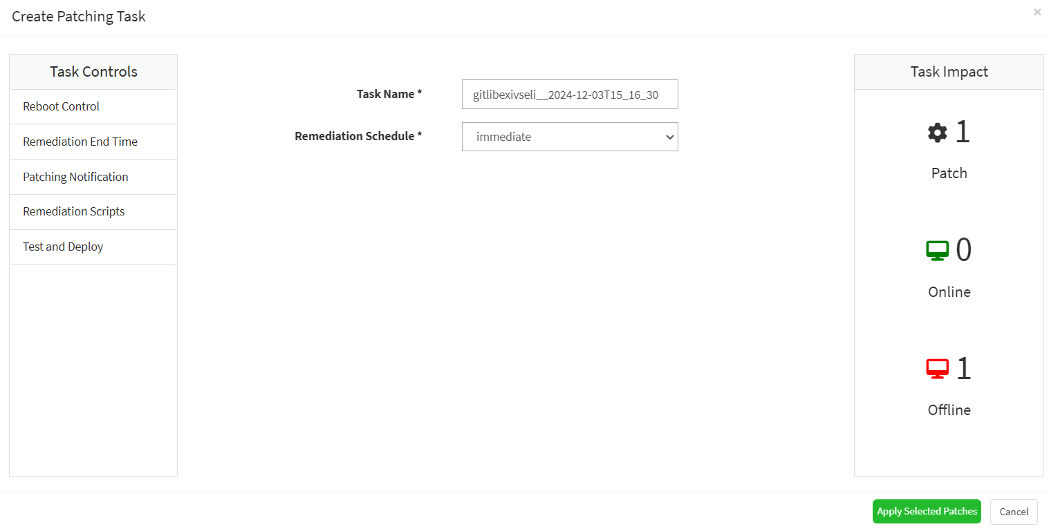 - Click on Apply Selected Patches and Create a patching task for remediation.