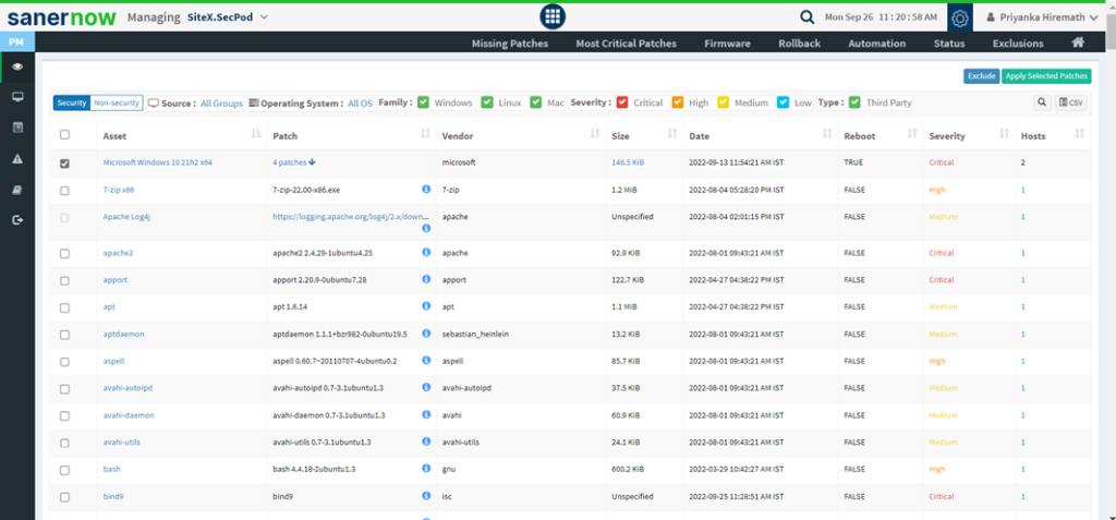 Saner VM introduces a new dashboard where you can view all the vulnerabilities with CVE IDs, severity, the number of assets affected, detected dates, and fix information. You are also provided with a search bar where you can search for exploit-specific keywords. You can act on these vulnerabilities by excluding them or by remediating them through the Quick Action section.