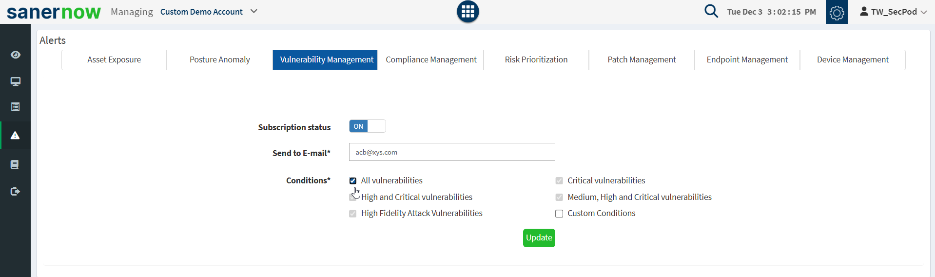 - Specify an email address to which the alerts will be sent and the category of vulnerability on which notifications will be based. You can also specify a custom condition based on CVEs.