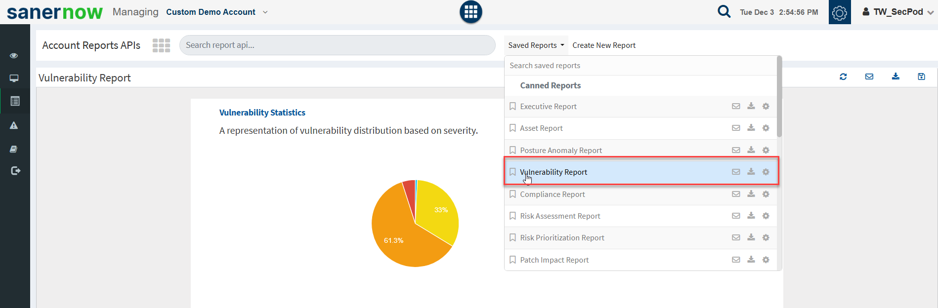 Saner VM provides an extensive range of reports to understand the vulnerability process. Go to the Reports option on the visibility dashboard to check the reports. You will get two types of reports: Canned reports and customizable reports. Users can access the available vulnerability reports from the Canned reports section.