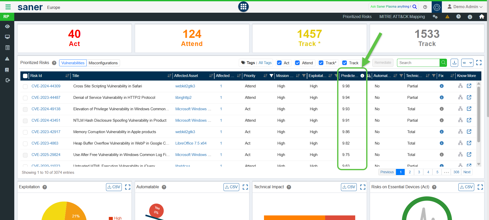 Patching all the vulnerabilities is quite often a daunting task for IT teams. However, with the Saner Risk Prioritization tool, you can prioritize patching the critical vulnerabilities first and then focus on the less severe ones. Saner Risk Prioritization uses the Stakeholder-Specific Vulnerability Categorization(SSVC) framework to categorize risks into four categories: Act, Attend, Track*, and Track. At the same time, Saner Risk Prioritization allows you to perform a deeper exploitation analysis of the risks by leveraging SecPod’s proprietary machine-learning algorithm.